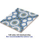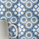 This ceramic tile features a harmonious blend of geometric and floral elements. The tile is adorned with a series of concentric circles, each layer boasting a different pattern and shade, creating a mesmerising visual effect. The outermost layer is chraacterised by bold blue outlines that form hexagonal shapes. These hexagons encapsulate delicate floral motifs painted in golden hues, adding a touch of warmth to the cool tones of the blue outlines. The intricate patterns and symmetry converge to create an artwork of visual harmony, making this tile a captivating piece of decor.