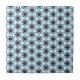 Intricate geometric patterns repeat in a symmetrical formation using blue, black, and white tones. The design focuses on circular motifs arranged to create a visually engaging and balanced effect.