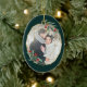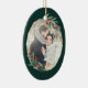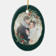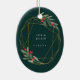 Elegant photo Christmas ornament features a favorite photo encircled by a faux gold foil oval geometric frame with green watercolor foliage and red berries. Add your names and the year, or a custom message, to the reverse side in a matching delicate geometric frame.