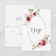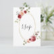 Wedding RSVP card features a geometric oval centerpiece with burgundy flowers and eucalyptus.
