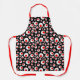 This kitchen apron has a geometric circle abstract pattern of red balls with bigger white balls scattered on a black background.