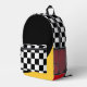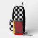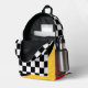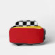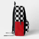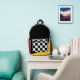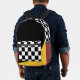 Cool backpack for an artist, featuring black and white geometric checkers pattern and highlights of red and yellow.