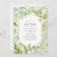 Trendy greenery baptism invite with gold geometric frame and sage green watercolor wash reverse designed to be quickly and easily customised to your event specifics.
