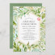Trendy greenery first holy communion invite with gold geometric frame and sage green watercolor wash reverse designed to be quickly and easily customised to your event specifics.