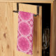 Hand towel in a geometric daisy pattern in coral pink and pastel pink, accented with deep coral