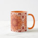 Mug in a geometric daisy pattern in mandarin orange, pastel orange.and deep rust red
