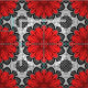 Fabric in a geometric daisy pattern in deep red / crimson on a black and white patterned background