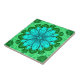 Ceramic tile in a geometric daisy pattern in turquoise and dark and light emerald green