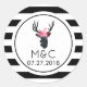 Wedding stickers with the couples initials and wedding date. Designed with a black deer head made with geometric lines and wearing a pink floral crown. Rustic and trendy design. Background is a pattern with black and white stripes.. Personalise with your initials and wedding date.