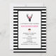 A birthday party invitation with a black deer head made with geometric line and wearing a pink floral crown. Rustic and trendy design. The background is black and white stripes. A white frame with a pink border layered over top.