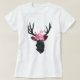 A t-shirt with a black deer head made with geometric line and wearing a pink floral crown. Rustic and trendy design.