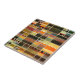 A modern kitchen or bathroom ceramic tile featuring a geometric chequered mosaic pattern in vibrant colours. Inspired by leaded glass or stained glass.