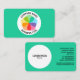 A business card template with a geometric abstract motif made up of five overlapping semi-transparent elliptical shapes in five different colours arranged around a centre point, creating a pentagon with a geometric flower like shape in the centre. The symbol is placed in a white circle with curved text company name and business type. Name and other contact details on the reverse using the white circle panel without the symbol with the name and job title placed inside and arranged to the left side.