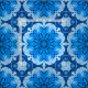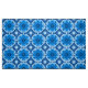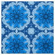 Fabric in a geometric flower pattern in bright cerulean / sea blue on a light blue background, accented with navy