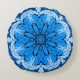 Round pillow in a geometric flower pattern in bright cerulean / sea blue on a light blue background, accented with navy