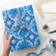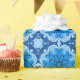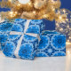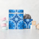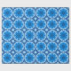 Wrapping paper in a geometric flower pattern in bright cerulean / sea blue on a light blue background, accented with navy