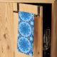 Hand towel in a geometric flower pattern in shades of light to dark denim blue, accented with navy