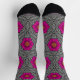 Socks in a geometric flower pattern adapted from an Art Nouveau floral - Deep fuchsia pink flowers against a geometric leafy background in silver grey accented with black