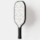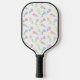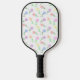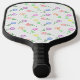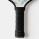 This pickleball paddle has a mid-century modern design of circles and circle parts made to look like flowers with stems made by continuous lines, repeating across the design.
