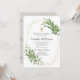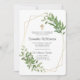 Composed of serif typography. All against a backdrop of white background with green foliage with faux gold cross and geometric frame. The back of the card has a wooden panel design.