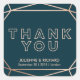 A modern winter wedding "Thank you" favor sticker, A modern wedding address label, features a "faux foil" gold rose geometric pattern over a dark turquoise background. All your details are spelled in a beautiful modern typo.