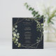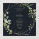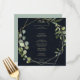 This geometric gold blue green calligraphy dinner menu card is perfect for a simple wedding. The design features hand-painted beautiful green leaves in a dark blue background, adorning a gold geometric frame.