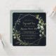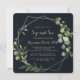 This geometric gold blue green calligraphy sip and see invitation is perfect for a simple meet the baby party. The design features hand-painted beautiful green leaves in a dark blue background, adorning a gold geometric frame.