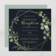 This geometric gold blue green wedding reception invitation is perfect for a simple post elopement party. The design features hand-painted beautiful green leaves in a dark blue background, adorning a gold geometric frame.
