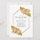 An elegant modern geometric gold framed blush and orange floral bridal champagne breakfast invitation.
