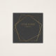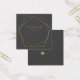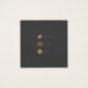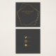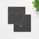 A simple, modern earring display card features a dark charcoal background with a luxe gold effect overlapping geometric frame, editable shop name, and two printed hole markers for consistent earring placement. The reverse includes coordinated gold social media icons with space for handles, making it easy for customers to follow, tag, and review after purchase while keeping the layout clean and legible. Colours, fonts, text, and size can be customised to match brand style. The gold is a printed effect.