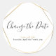 This modern Change the date sticker features your names and wedding date with modern gold effect geometric border and "Change the Date" written in a matching gold coloured elegant script.