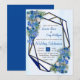 Geometric gold-navy frames with blue corn-flowers, white roses & arum-lilies, blue spring flowers with a light blue textured paper background