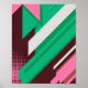 The design features bold diagonal geometric shapes in emerald green, light pink, and white, layered over a dark maroon background. The background is enriched with a gradient of pink circular dots, fading gradually to create depth and a pop-art inspired effect. The sharp-angled stripes and overlapping colours convey a sense of modernity, movement, and dynamic energy.