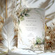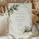 This elegant wedding invitation combines the natural charm of watercolor greenery with the sophisticated sparkle of faux gold accents. A geometric arrangement adds a modern twist to the organic eucalyptus leaves, showcased in varying shades of jade, seafoam, and hunter green. The invitation is framed with delicate gold splatters and branches, adding a touch of luxury. Perfect for a chic and contemporary wedding, this invitation will enchant your guests with its unique blend of classic botanical beauty and modern design elements.