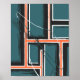 This design features a structured composition of interlocking rectangular shapes filled with dark teal tones and bordered by bold black and white outlines. Bright orange lines run horizontally and vertically across the layout, creating a sense of intersecting pathways. Layered over this precise geometric grid are light, free-form brush strokes in soft gray, adding a dynamic, hand-drawn contrast to the rigid framework. The overall aesthetic blends order with spontaneity, producing a modern abstract visual that feels both architectural and expressive.