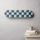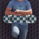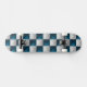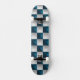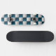 This skateboard features a geometric pattern chequerboard squares design with a triangular motif in a modern, minimalist style. The pattern consists of alternating metallic blue and metallic silver triangular shapes arranged in a grid formation. The truck width is 5.25. The trucks are all terrain skateboard trucks.
