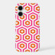 Modern geometric pattern of hexagons and crosses in pink, orange, white.