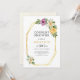 Gold foil polygon geometric floral wedding couples shower invitation. It features a gold polygonal frame with your text and a bouquet of watercolor flowers on the upper right corner and a flower at the left bottom. The back includes a polka dot pattern.