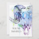 All occasion party invites easy to read for you to personalise. These feature an artistic ram skull drawing with geometric touches here and there and watercolor splashes and drips in the colours of blue purple and yellow on white on one side.