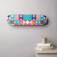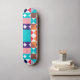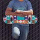 Abstract geometric skateboard in blue, turquoise, red, black, and orange colours.