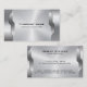 This silver-grey metallic texture business card design features a simple silver metallic texture accented with a metal geometric design.
