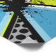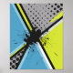 The design features a bold and modern geometric composition divided into four triangular sections that converge at the centre. The colours used are light blue, lime yellow, light grey, black, and white. At the intersection, there is a dramatic black paint splatter with scattered streaks and droplets, adding a sense of energy and movement. The grey section is decorated with a halftone dot pattern in black, evoking a pop art aesthetic. Thick dividing lines in black, white, and yellow separate the sections, creating strong contrast and a dynamic visual impact.