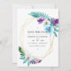 Turquoise and purple watercolor tropical leaves wedding save the date with gold geometric frame and elegant typography.