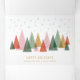 A minimalist design showcasing a colourful forest of stylised, geometric trees under falling snowflakes. The bright colours and modern shapes create a joyful and festive holiday atmosphere.