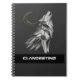 An elegant notebook with a geometric wolf design howling at the moon in a black and gold style. It represents strength, freedom, and mystery in a minimalist and modern aesthetic.
