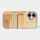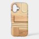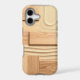 Geometric wooden panels are arranged against a textured sand backdrop, creating a visually interesting contrast between the smooth wood grain and the fine sand