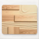 Geometric wooden panels are arranged against a textured sand backdrop, creating a visually interesting contrast between the smooth wood grain and the fine sand