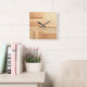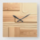 Geometric wooden panels are arranged against a textured sand backdrop, creating a visually interesting contrast between the smooth wood grain and the fine sand