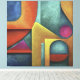 Geometric shapes in vibrant colours intertwine in a visual dialogue between curves and angles. The composition reveals balance and contrast, as if each colour and line were pieces of an artistic puzzle that unites reason and emotion.