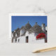 Postcard of red geranium flowers and a row of conical shaped traditional trulli houses with stone roofs in a street in Alberobello town in Puglia, Southern Italy.